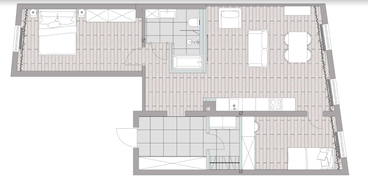 Dla rodziny 2+1 lub 2+2 – dwie sypialnie, a przestrzeń dzienna jest duża i ustawna.