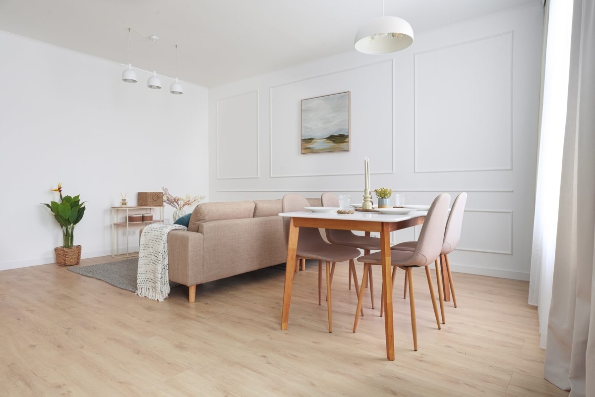 przestronnego salonu z aneksem kuchennym, z miejscem na część wypoczynkową i jadalnianą,