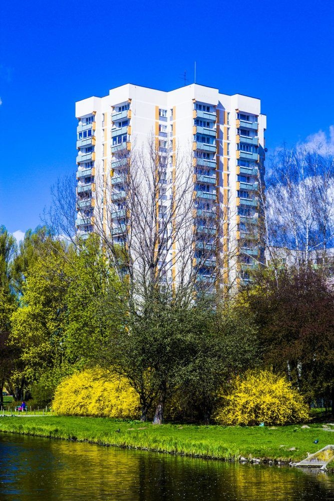 Z okien i balkonu rozciąga się otwarty widok zapewniający poczucie przestrzeni, światła i prywatności — rzadko spotykane w nowej zabudowie tej części miasta.