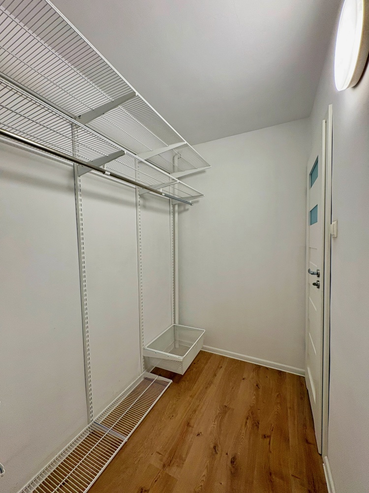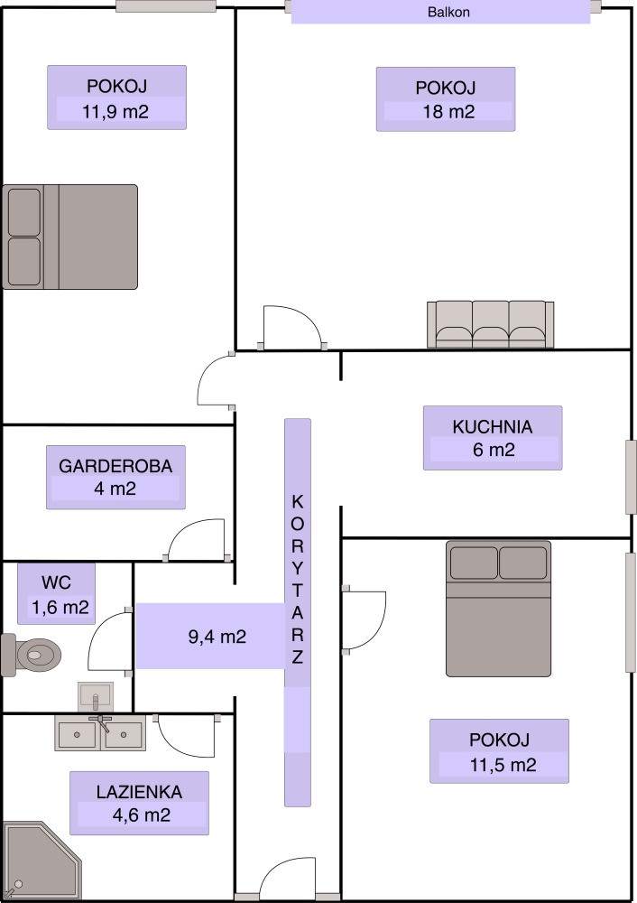Duży potencjał aranżacyjny — większość ścian działowych można przestawić lub usunąć (np. możliwość stworzenia sypialni master z garderobą i łazienką lub otwarcia kuchni na salon).