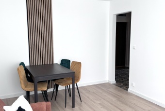 – Salon z balkonem francuskim, jasny i przestronny, z wydzieloną strefą wypoczynkową oraz jadalnianą – urządzone i gotowe do zamieszkania.