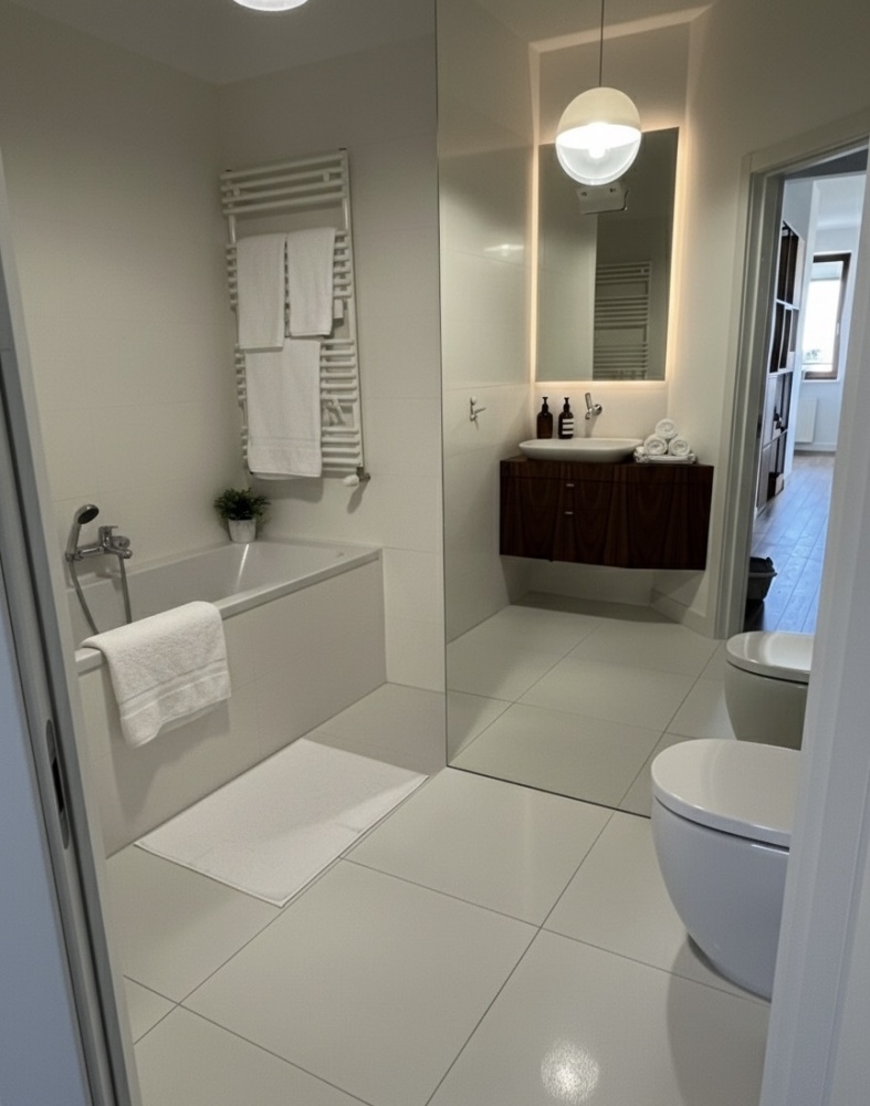 • eleganckiej łazienki, pralni z garderobą
