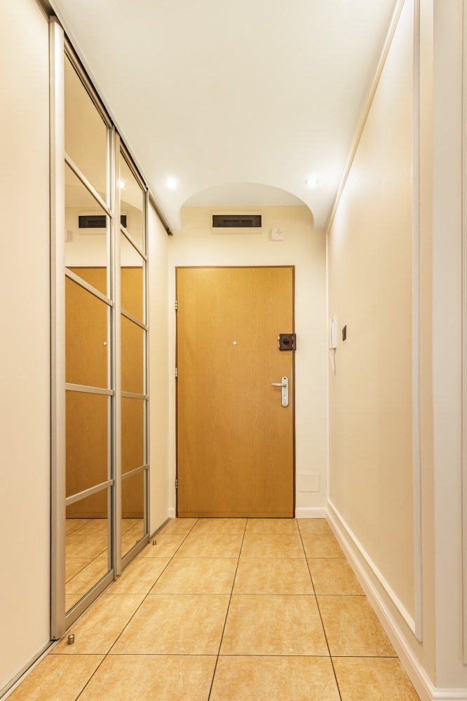 Wnętrza zostały starannie odświeżone — wykonano malowanie ścian farbami Flugger oraz cyklinowanie jesionowego parkietu. Całość uzupełniają pełne, drewniane drzwi Porta, kuchnia w zabudowie na wymiar oraz wyposażenie meblowe salonu i pokoi. Mieszkanie sprzedawane jest z wyposażeniem widocznym na zdjęciach, z wyłączeniem elementów home stagingu.