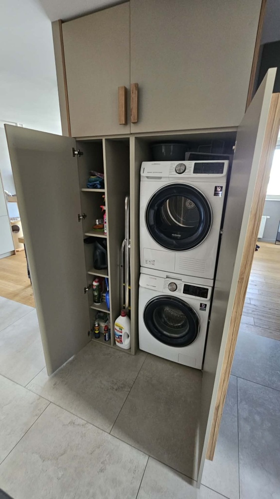 W korytarzu, tuż przy wejściu do mieszkania, znajdują się dwie bardzo pojemne szafy. Jedna przeznaczona typowo na obuwie, druga na kurtki, płaszcze i inną odzież wierzchnią. Bliżej kuchni, do dyspozycji lokatorów jest kolejna, robocza szafa, w której znajdują się pralka (Samsung) oraz suszarka (Samsung). W drugiej części szafy półki, umożliwiające przechowywanie środków czystości, środków do prania itp.