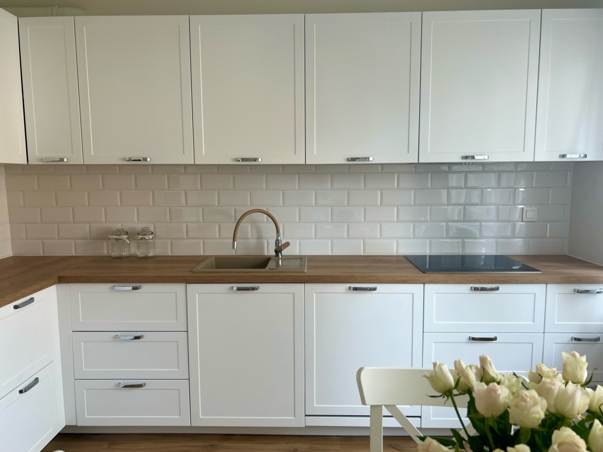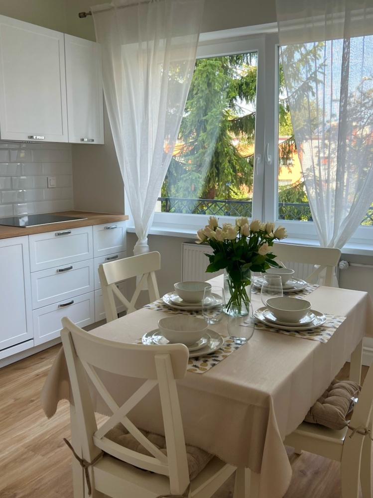 Kuchnia (~12m2): przestronna i nowoczesna kuchnia, w pełni wyposażona – nowy sprzęt AGD (lodówka, zmywarka, piekarnik, kuchenka) wraz z jadalnią (stół, 4 krzesła)
