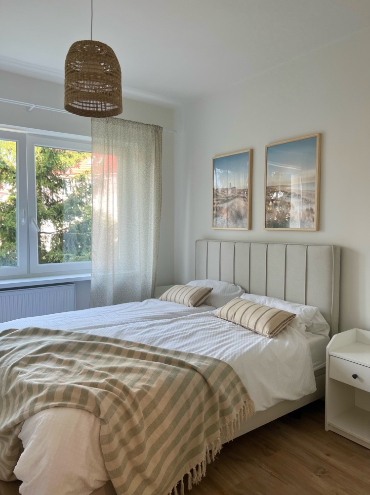 Sypialnia (~12m2): przytulna sypialnia, podwójne łóżko kontynentalne (możliwość rozłączenia na dwa osobne łóżka), szafa, komoda, toaletka/biurko z krzesłem, lustro, stoliki nocne