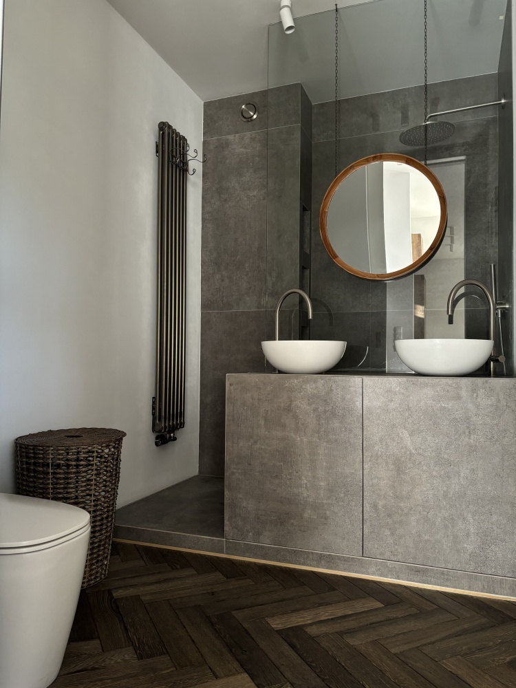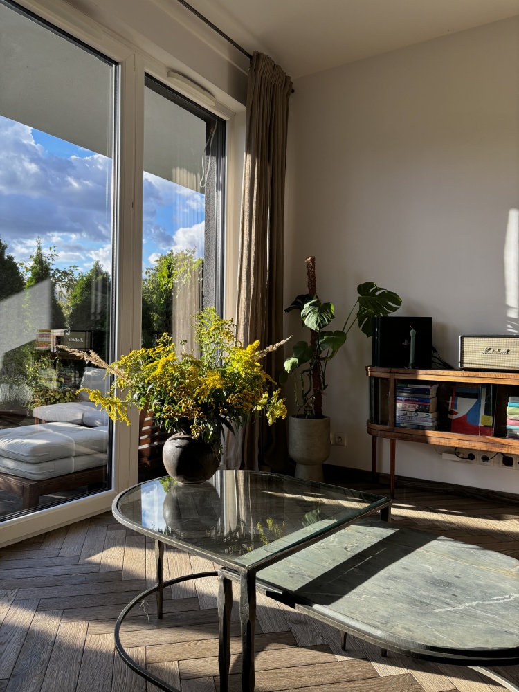 Mieszkanie wyróżnia się wystrojem, który nadaje mu niepowtarzalny charakter. Rozwiązania aranżacyjne m.in. w postaci wysokich przesuwnych drzwi łączą funkcjonalność z wyjątkowym stylem. Ciepła i przytulności wnętrzu dodaje drewniany parkiet z palonego dębu firmy Chapel, który znajduje się na powierzchni całego mieszkania, tworząc spójną i wyjątkową przestrzeń. Dodatkowym atutem jest ekspozycja zachodnia – pomieszczenia i ogródek są dobrze doświetlone od wczesnych godzin popołudniowych.