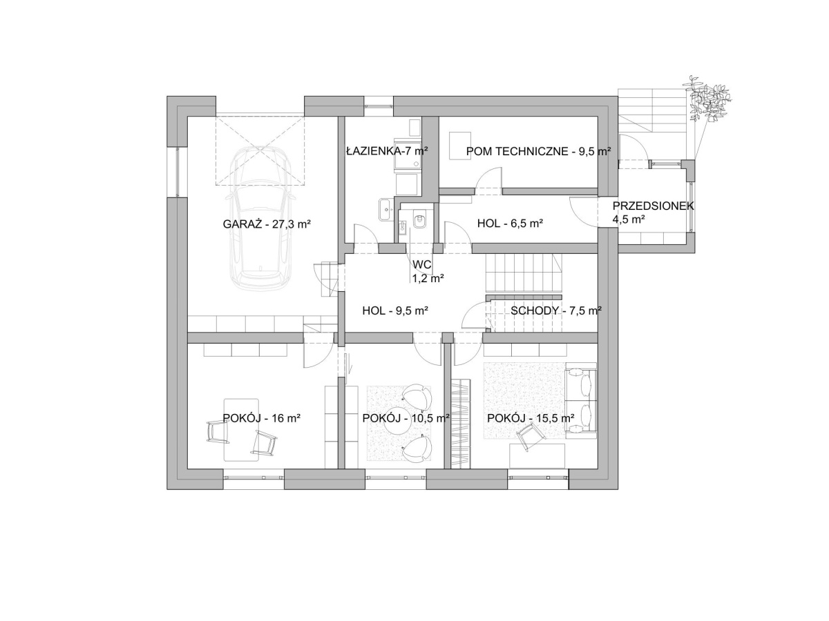 • Wbudowany garaż – 27,5 m2 z uchylną bramą na pilota, z oknem
