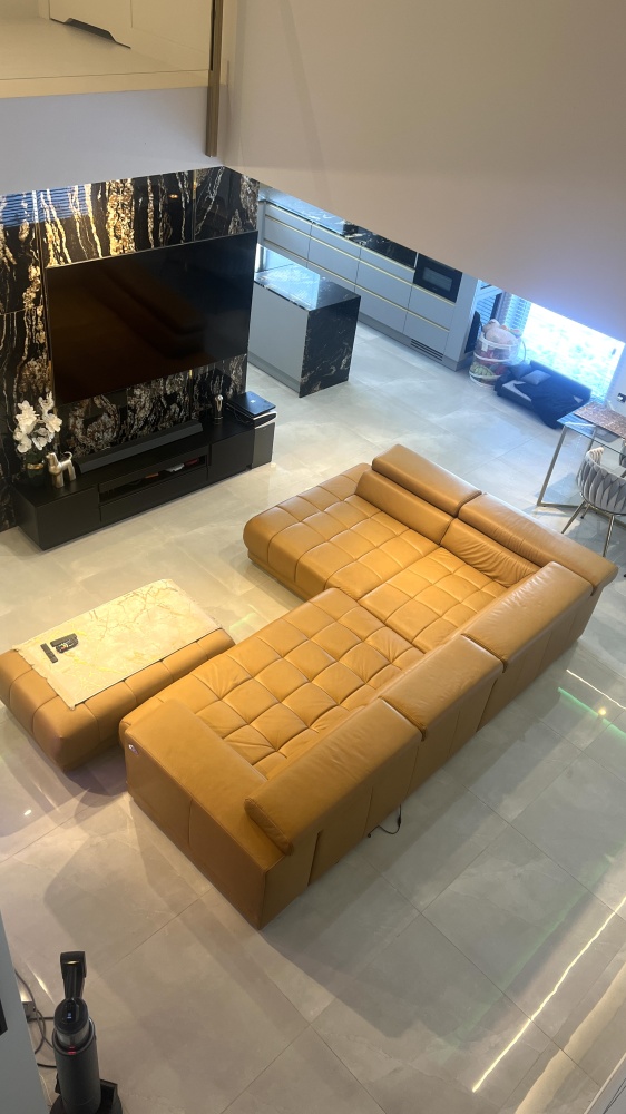 * 3 metrowa kanapa w salonie na zamówienie z naturalnej skóry bydlęcej wraz z elektrycznie regulowanym siedziskiem