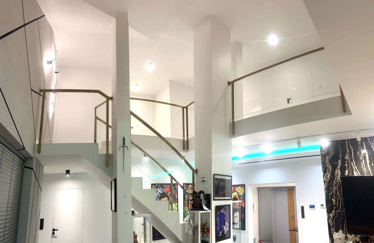 * balustrady szklane wykonane na zamówienie wraz ze złotymi poręczami