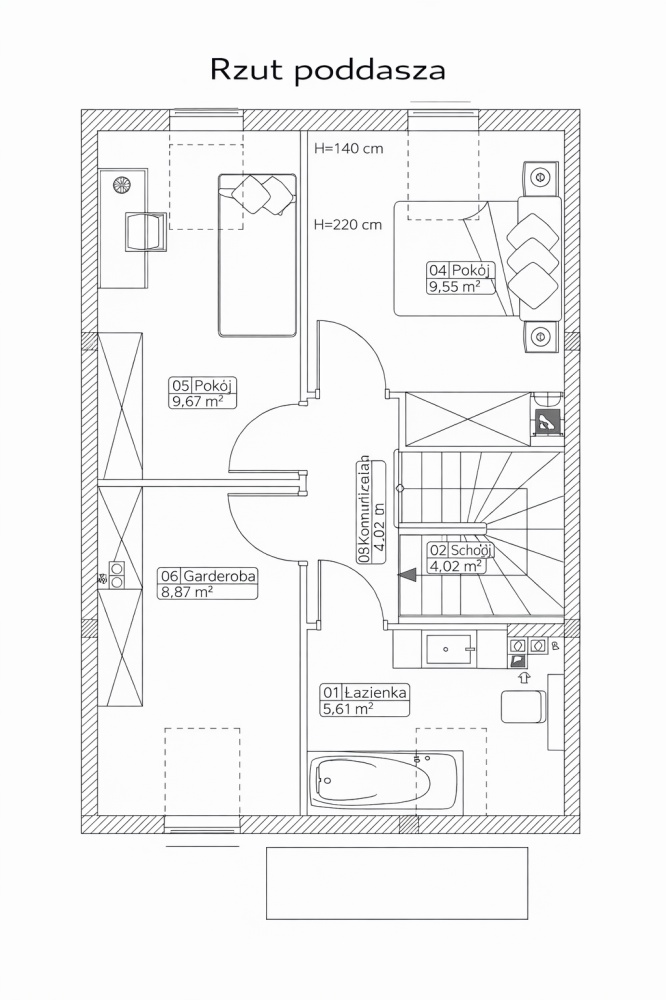 Domy posiadają funkcjonalny układ pomieszczeń oraz dodatkową przestrzeń strychową.