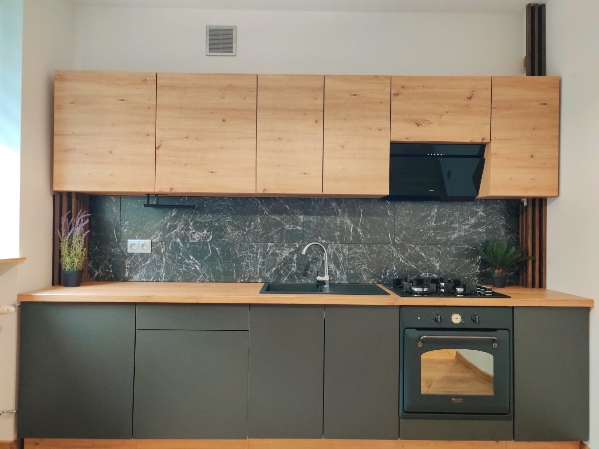 Mieszkanie wyposażone: kompletnie wyposażona Kuchnia: (lodówka, kuchenka gazowa z piekarnikiem, stół z krzesłami, szafki), łazienka: (kabina prysznicowa, pralka, geberit, szafka z umywalką), Pokój: zestaw wypoczynkowy, stolik kawowy, szafa.