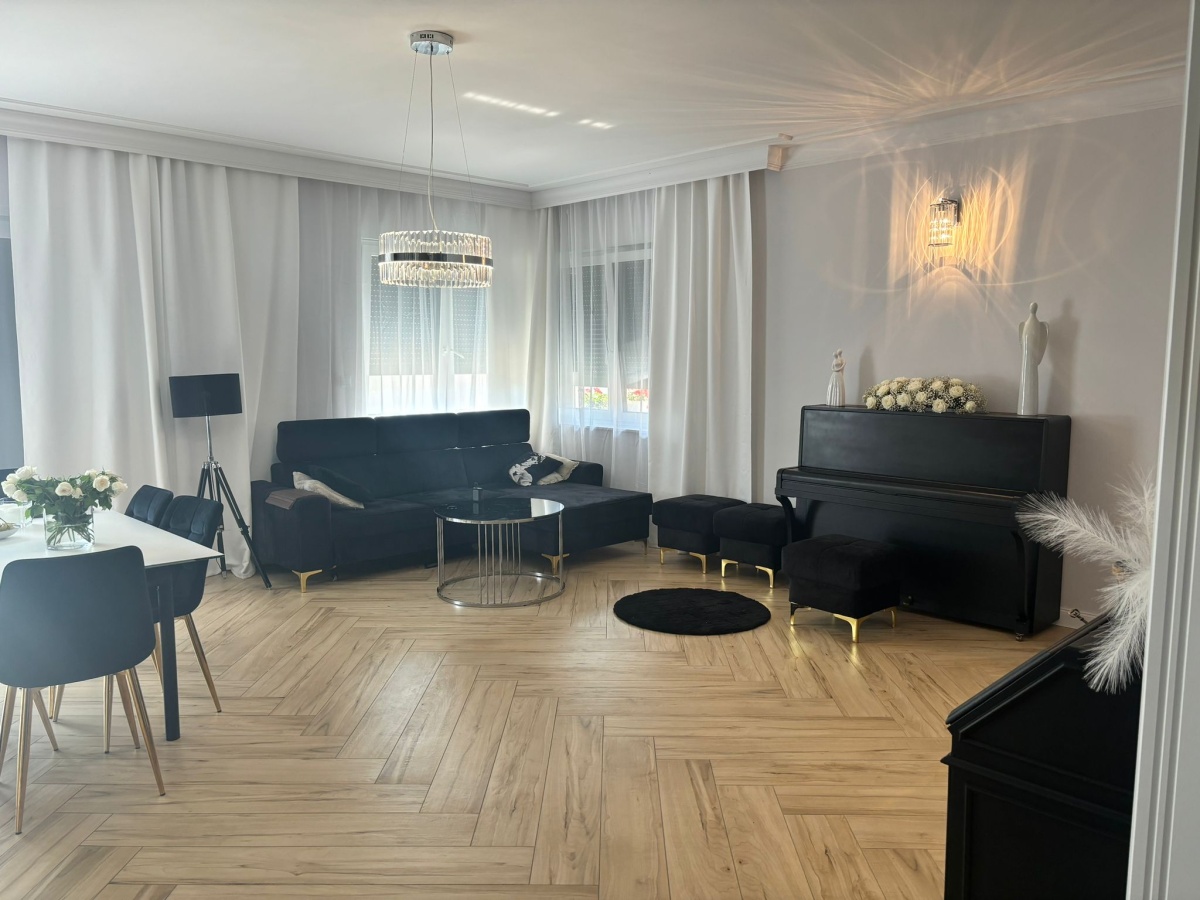 Przestronny, doświetlony salon z aneksem kuchennym to klasyka w nowoczesnym i wyrafinowanym wydaniu. Zastosowano prostą neutralna bazę: jasne podłogi (gresy) i ściany oraz kilka antycznych, mocnych akcentów. Sufity zdobi sztukateria.