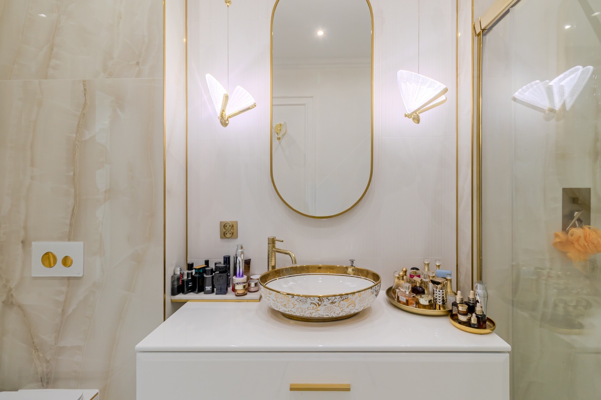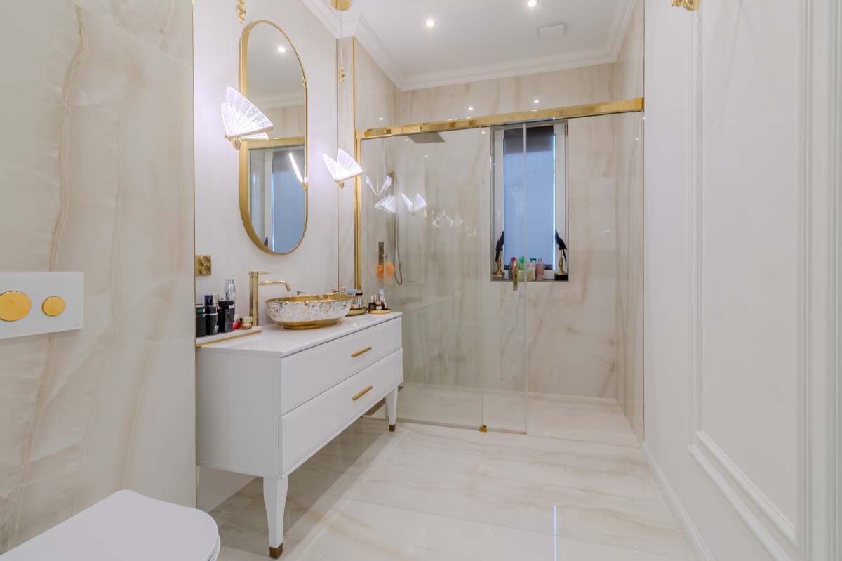 – jasna nowoczesna łazienka z niespotykanym wyposażeniem, w harmonijnym połączeniu bieli i złota