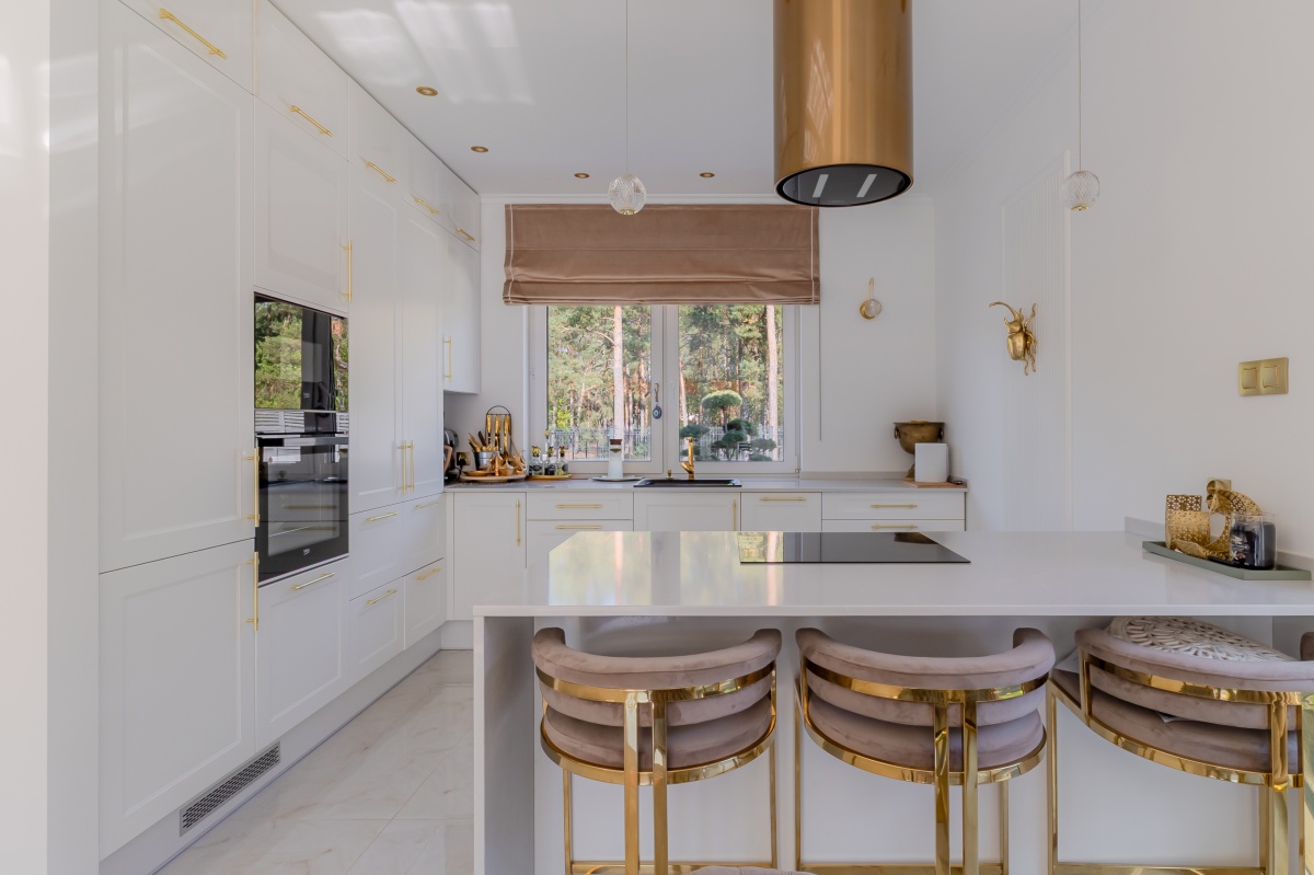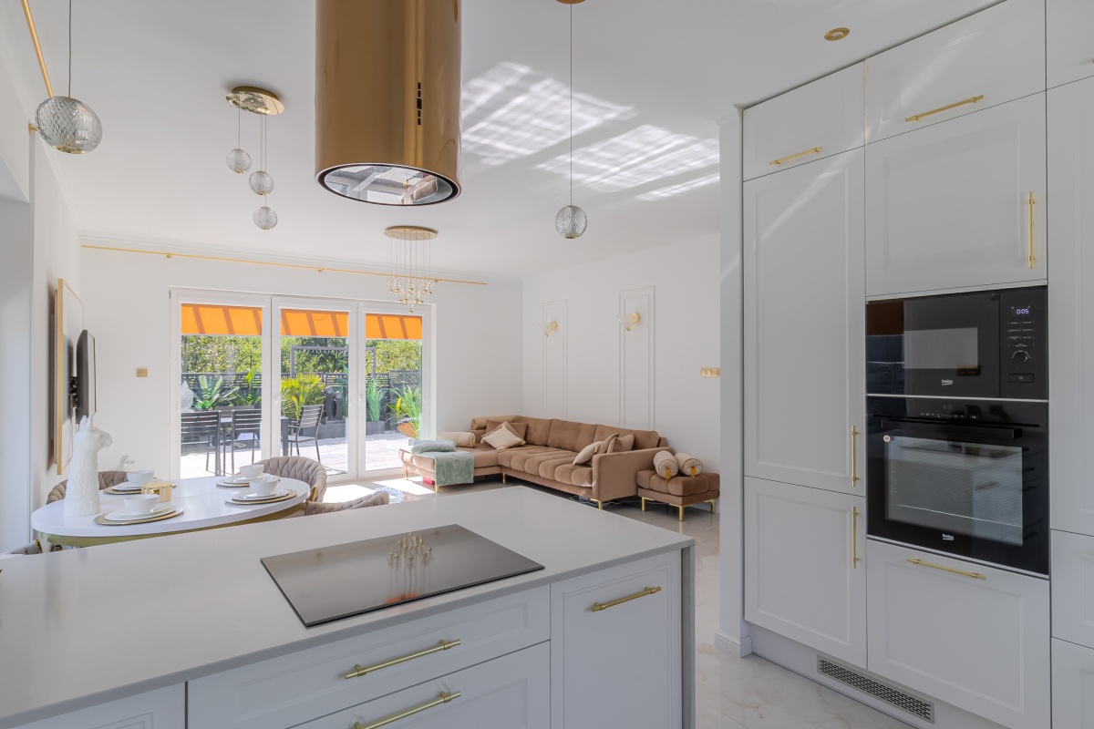 – elegancki aneks kuchenny z zabudową na wymiar i nowoczesnym sprzętem AGD nadaje luksusowego charakteru w połączeniu z jadalnią z designerskimi meblami i oświetleniem,