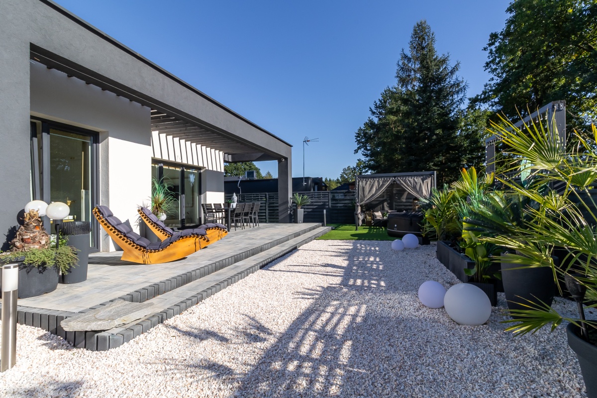 Za drzwiami czeka starannie zaprojektowana przestrzeń prywatności i relaksu oraz zadbany ogród z niepowtarzalną roślinnością