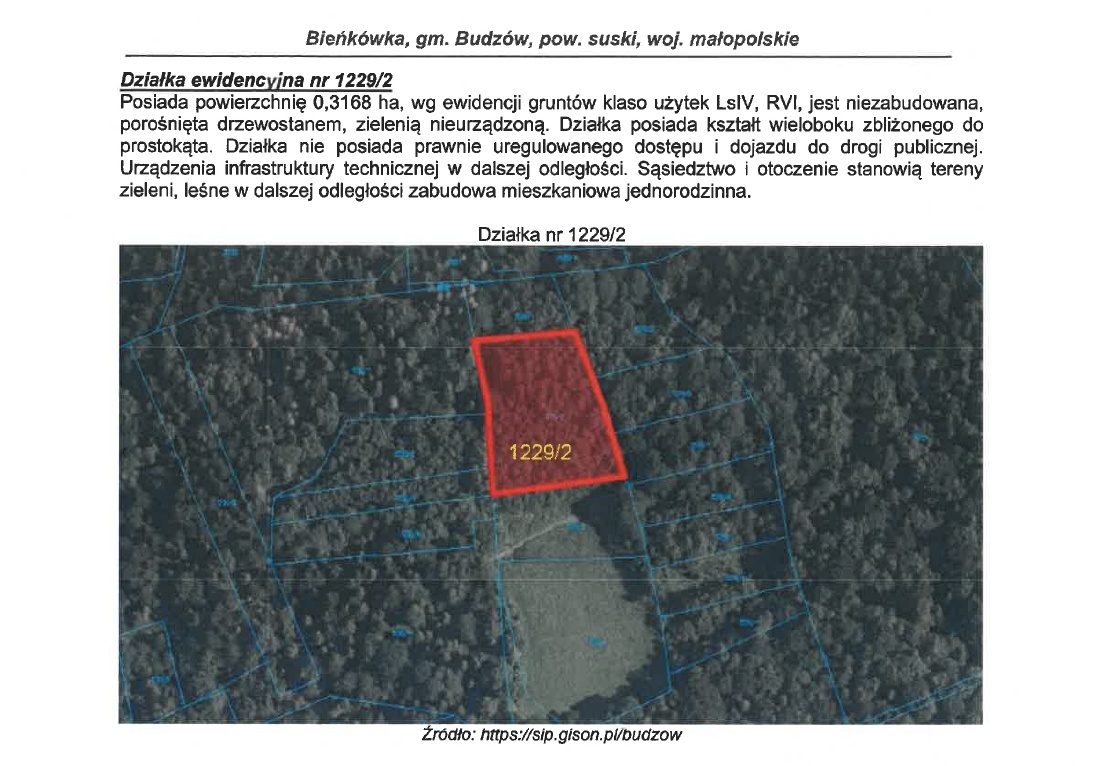 Syndyk masy upadłości Zofii Gaury, osoby fizycznej nieprowadzącej działalności gospodarczej w ramach postępowania upadłościowego sygn. akt KR1S/GUp-s/584/2023 zaprasza do składania pisemnych ofert w konkursie na sprzedaż prawa własności nieruchomości gruntowej stanowiącej niezabudowaną działkę ewidencyjną nr 1229/2 o powierzchni 0,3168 ha położonej w miejscowości Bieńkówka, gmina Budzów, powiat suski, dla której Sąd Rejonowy w Suchej Beskidzkiej IV Wydział Ksiąg Wieczystych prowadzi księgę wieczystą numer KR1B/00037879/1. Działka nie posiada prawnie uregulowanego dostępu i dojazdu do drogi publicznej.
