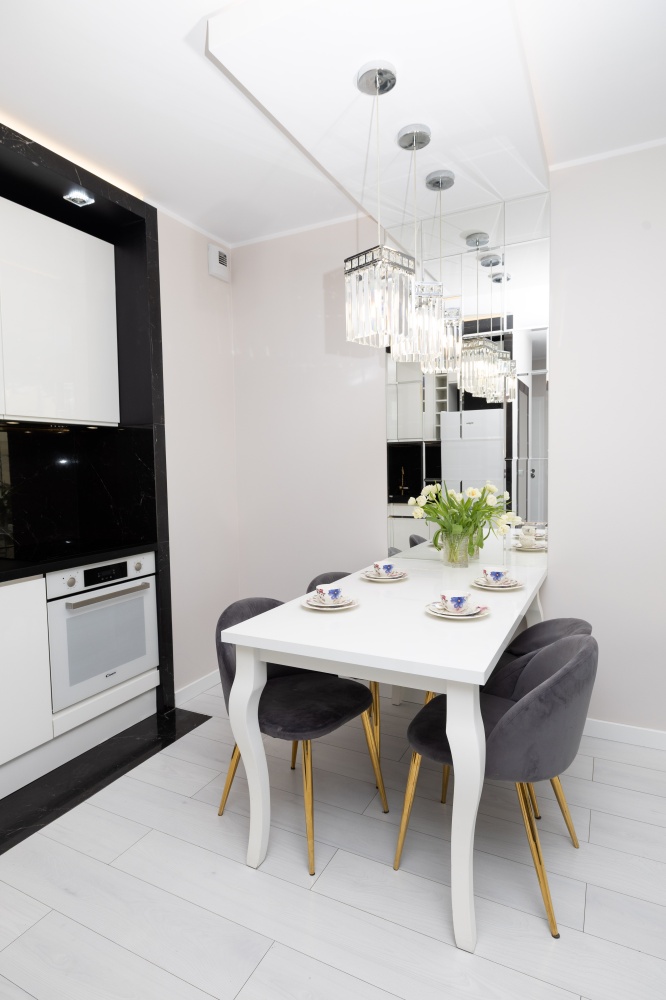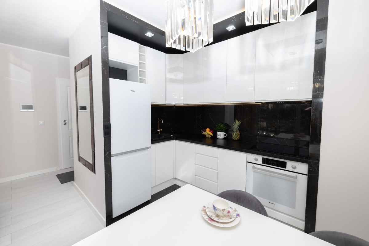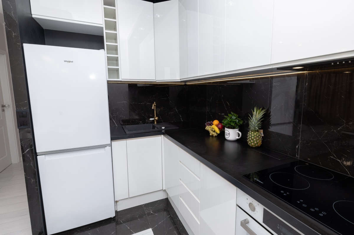 Aneks kuchenny, to połączenie bieli minimalistycznych mebli oraz czerni marmurowych kafli, tak charakterystyczne dla stylu glamour. Dopełnienie tej kompozycji stanowi konglomeratowy zlew, mosiężny kran i markowy sprzęt AGD: zmywarka, lodówka z zamrażarką, piekarnik oraz płyta indukcyjna i pochłaniacz.