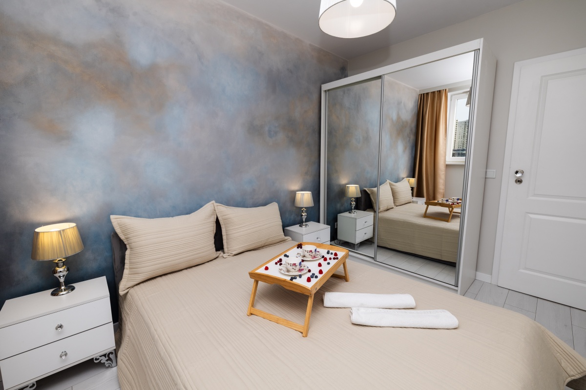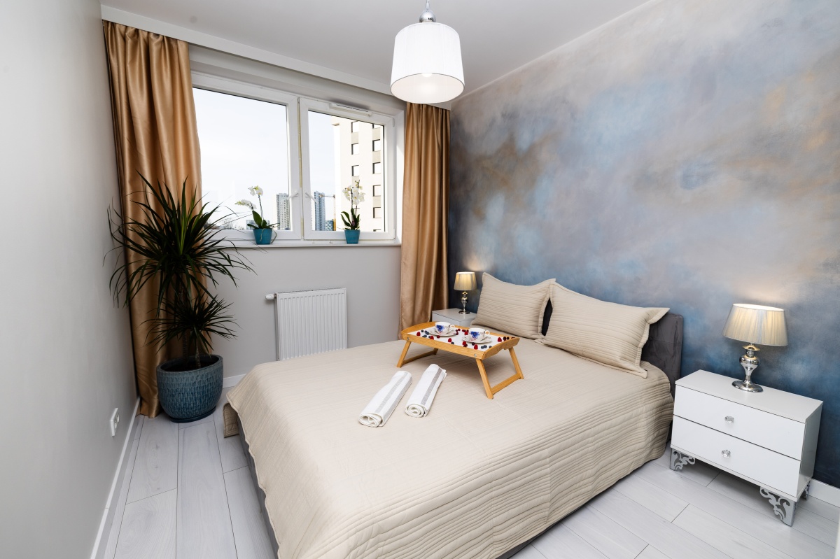 Skąpana w beżach i złocie sypialnia została wyposażona w welurowe łóżko z wygodnym oparciem oraz 2 drzwiową szafę z lustrzanymi drzwiami przesuwnymi oprawionymi w białe ramy. Niepowtarzalny urok tego miejsca zapewnia ściana z artystycznym malowidłem wykonanym w technice ombre, inspirowana burzowym niebem, przez które przebijają się złote refleksy zachodzącego słońca. Uzupełnieniem tej kompozycji są utrzymane w barwach szarości i srebra lamki nocne ustawione na białych szafkach w stylu glamour z kryształowymi gałkami.
