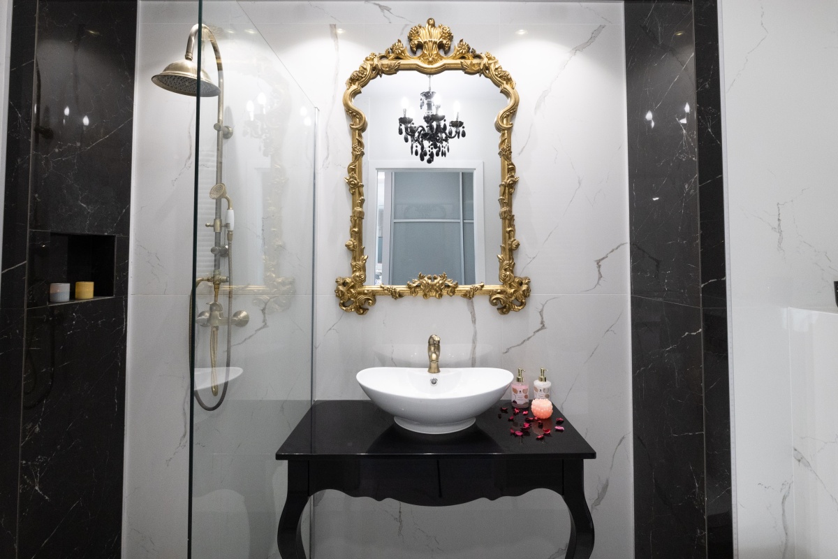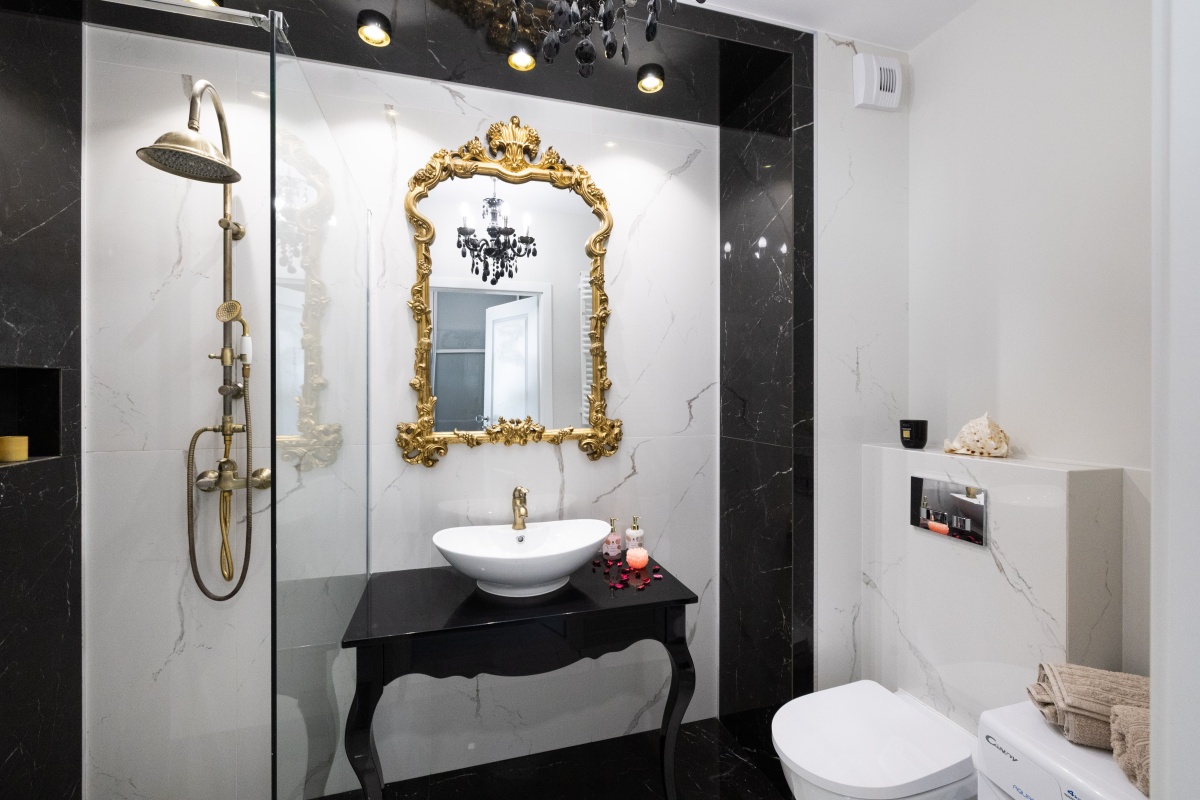 Barokowy przepych i elegancja to cechy łazienki utrzymanej w barwach bieli i czerni przełamanej różnymi odcieniami złota. Komfort i wygodę zapewnia obszerna kabina prysznicowa osłonięta hartowaną szybą. Centralnym punktem kompozycji jest designerskie lustro, oprawione w złotą bogato zdobioną ramę, dominującą nad białą ceramiczną umywalką osadzoną na czarnej, stylowej konsoli.