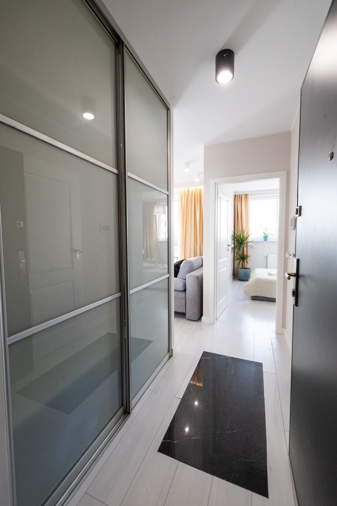 Prezentowany apartament otwiera przedpokój, którego atutem jest obszerna szafa wnękowa, dyskretnie ukryta za przesuwanymi drzwiami z mlecznego szkła. Przedpokój zaprasza do eleganckiego i dobrze doświetlonego zachodnim słońcem salonu oraz przytulnej sypialni i stylowej łazienki. Od razu widać, iż we wnętrzu rządzi szlachetna, stonowana i delikatnie zróżnicowana kolorystyka, z dominującym beżem ścian, szarością betonów i tkanin, bielą mebli, co w połączeniu z kryształowymi i złotymi dodatkami inspirowanymi stylem glamour stało się znakiem rozpoznawczymi prezentowanego apartamentu.