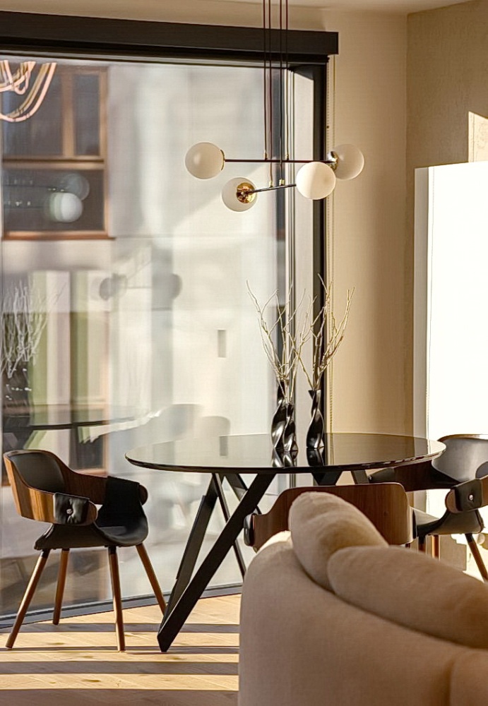 Panoramiczne okna od podłogi po sufit otwierają wnętrze na otoczenie, zapewniając niezwykłą jasność. Naturalne światło wypełnia każdy zakątek, podkreślając harmonię kolorów i lekkość aranżacji.