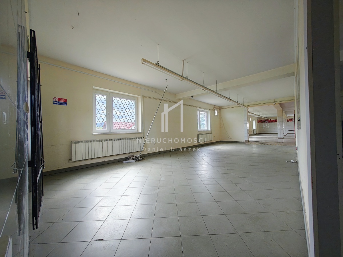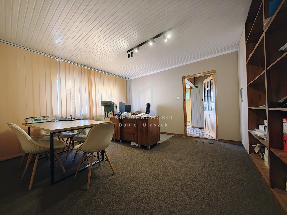 Na parterze znajduje się duża sala z witrynami, a w piwnicy – przestrzeń magazynowa lub użytkowa. Na piętrze – niezależne mieszkanie (6 pokoi z aneksem kuchennym), które może pełnić funkcję zaplecza lub wynajmu długoterminowego.