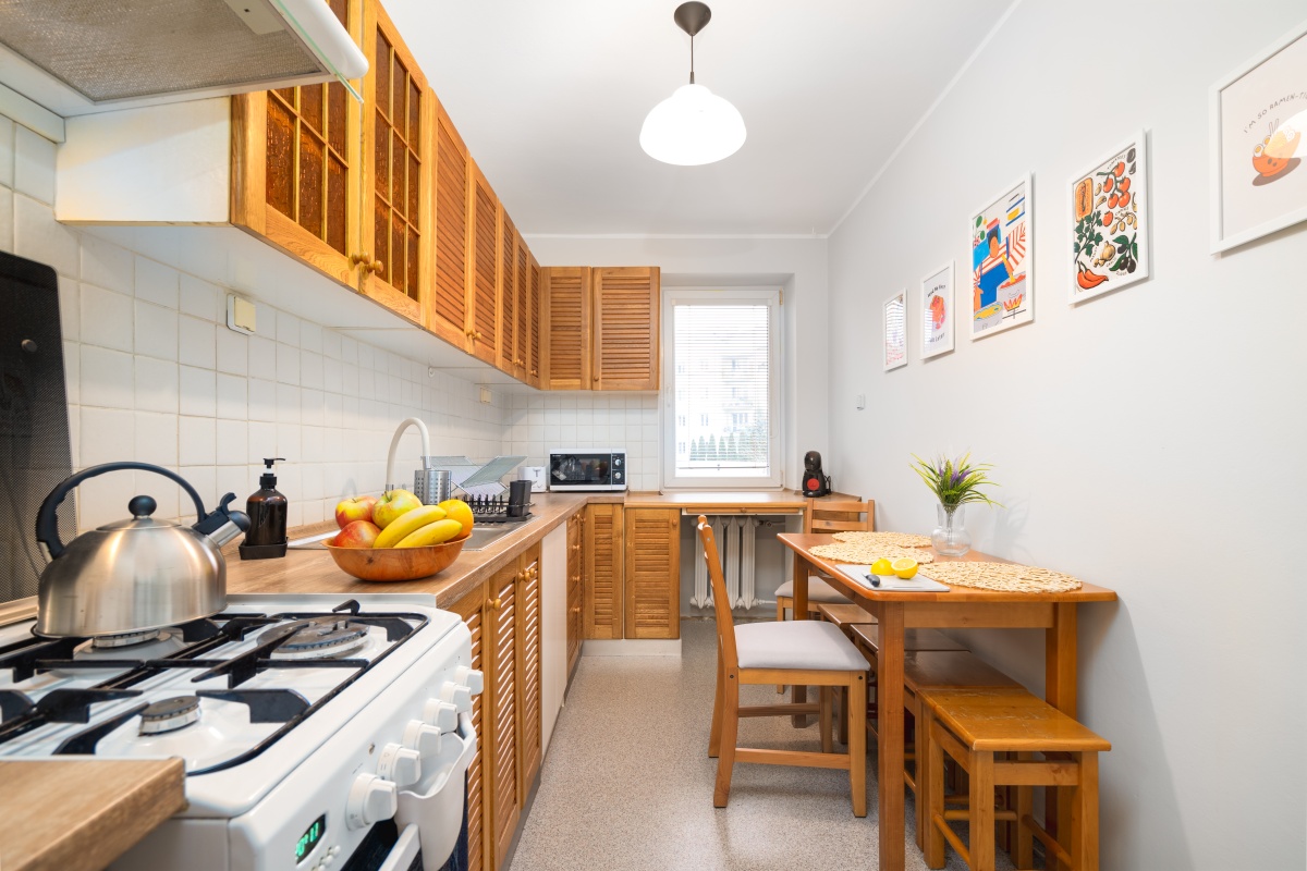 • Kuchnia jest wyposażona w talerze, sztućce, kubki, szklanki, garnki i patelnie.