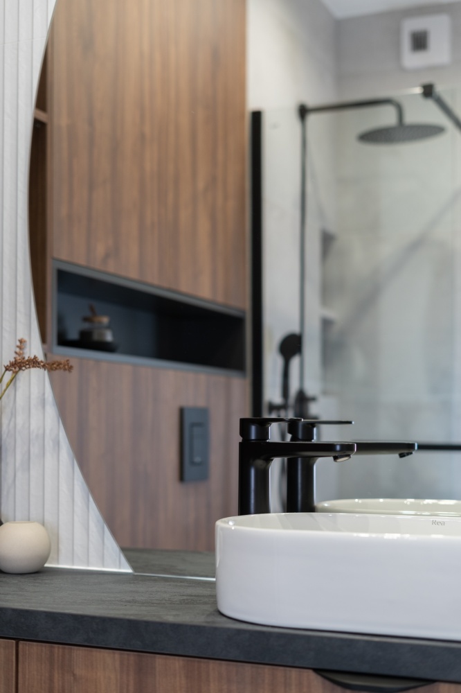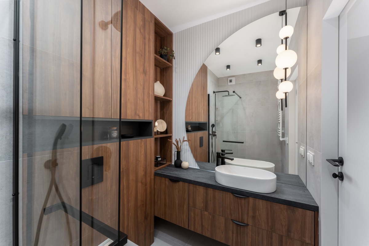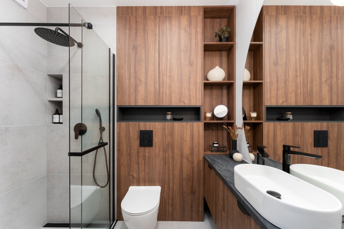 Nowoczesna łazienka z komfortowym ogrzewaniem podłogowym, dużą kabiną prysznicową i stylową zabudową.