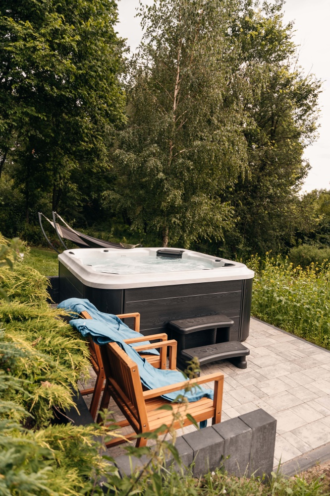 Strefa Relaksu: Jacuzzi z widokiem na Bug, strefa medytacji wśród zieleni, taras i ogród schodzący prosto do wody.