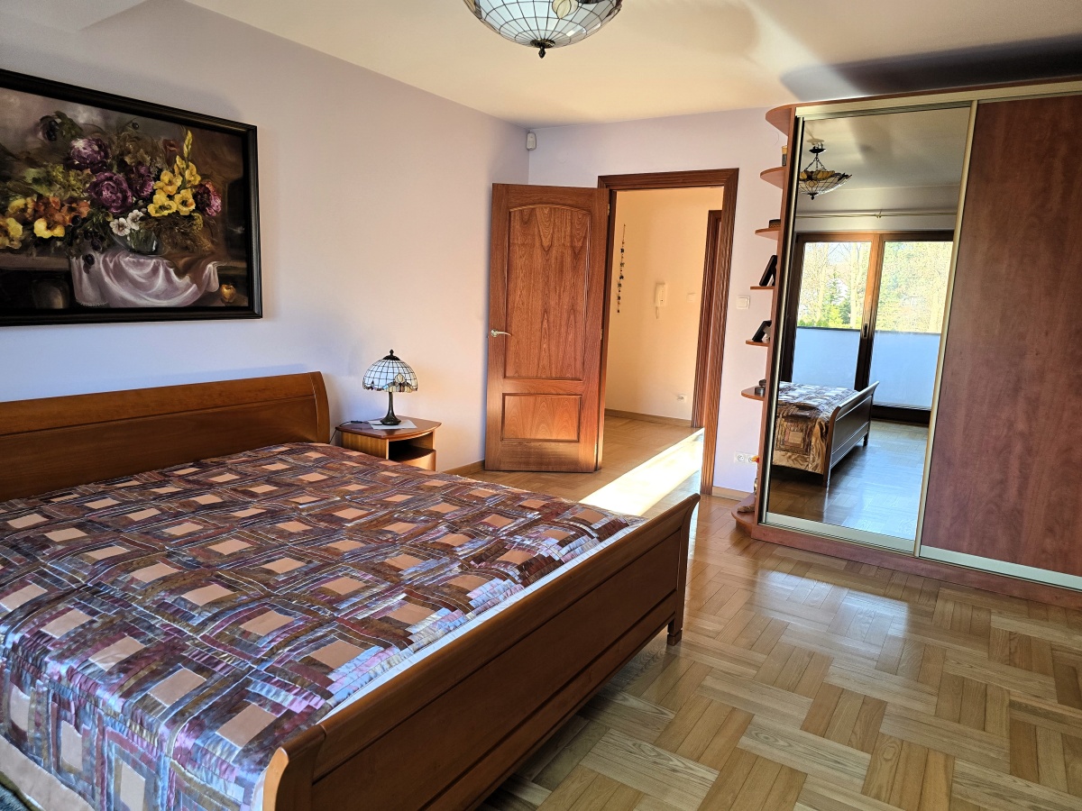 – główna sypialnia z obszerną ponad dziesięciometrową garderobą z oknem (10,30 m2) oraz z wyjściem na balkon